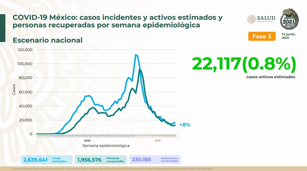 El total de defunciones se ubicó en 230 mil 185, mientras la ocupación hospitalaria se mantiene en niveles bajos de 14 para las camas generales y 13 por ciento de las que tienen ventilador para pacientes críticos.