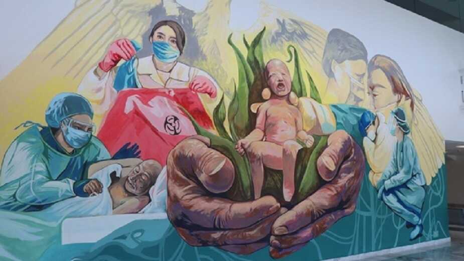 Explicó que estos murales pintados por 28 artistas en paredes y muros de 22 unidades médicas del Seguro Social reflejan las miradas decididas de una enfermera con Equipo de Protección Personal, un quirófano en el que una mujer da a luz en plena pandemia, o pacientes agradeciendo el esfuerzo del personal de salud.