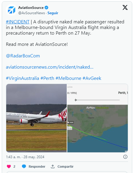 Un vuelo de Virgin Australia, identificado como VA696, tuvo que regresar al aeropuerto de Perth, debido a la conducta problemática de un pasajero que causó gran conmoción al correr desnudo por el pasillo del avión.